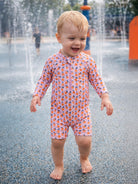 Dress your little one in style while protecting his skin with the Sonny Rashguard Swimsuit. This one-piece features a convenient zipper front closure for easy dressing. If you want excellent UPF 50+ protection and style, make a splash in the Sonny Rashguard Swimsuit.