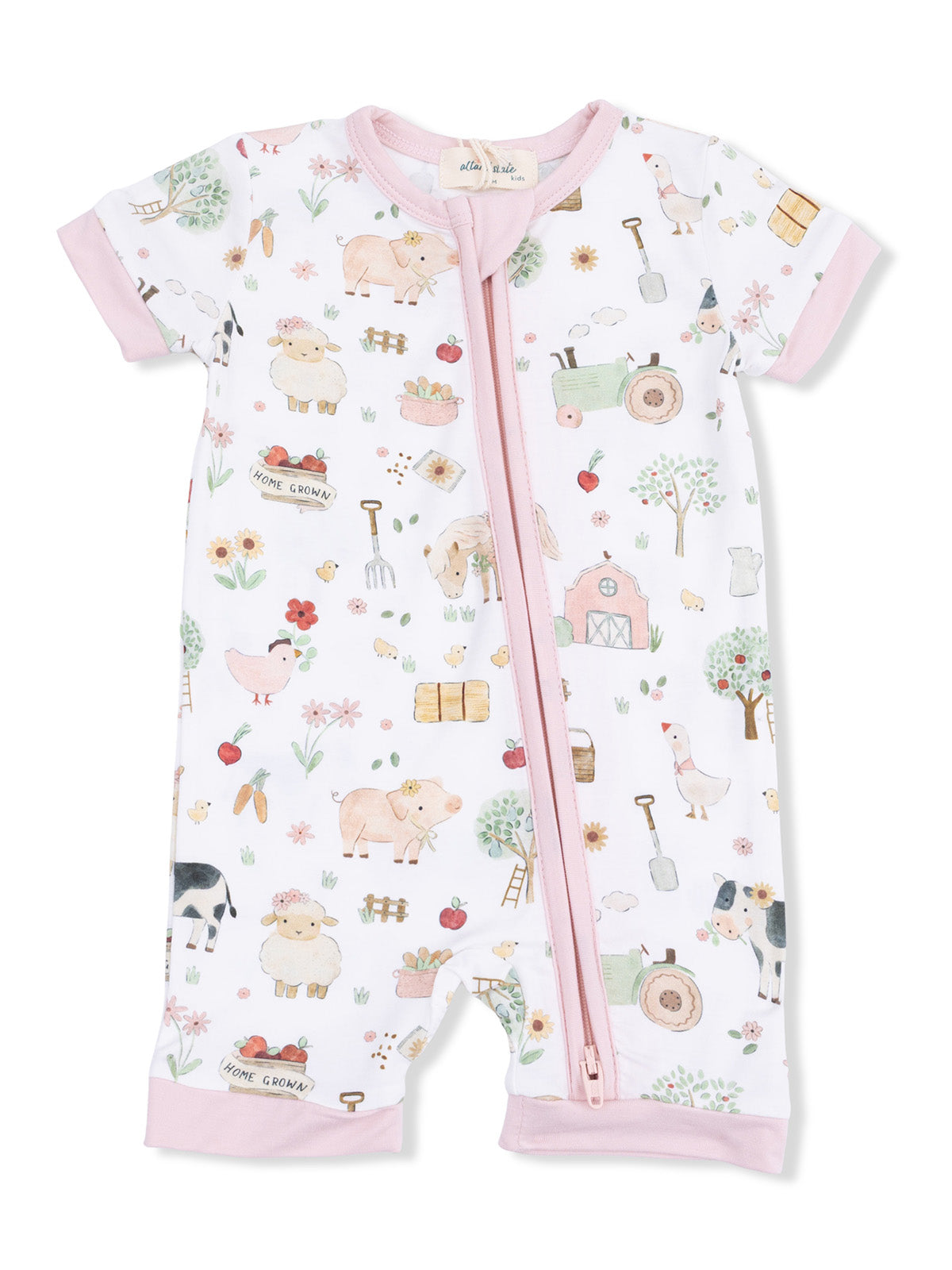 Shortie 2-Way Zip Romper, Cute Farm Animals Pink